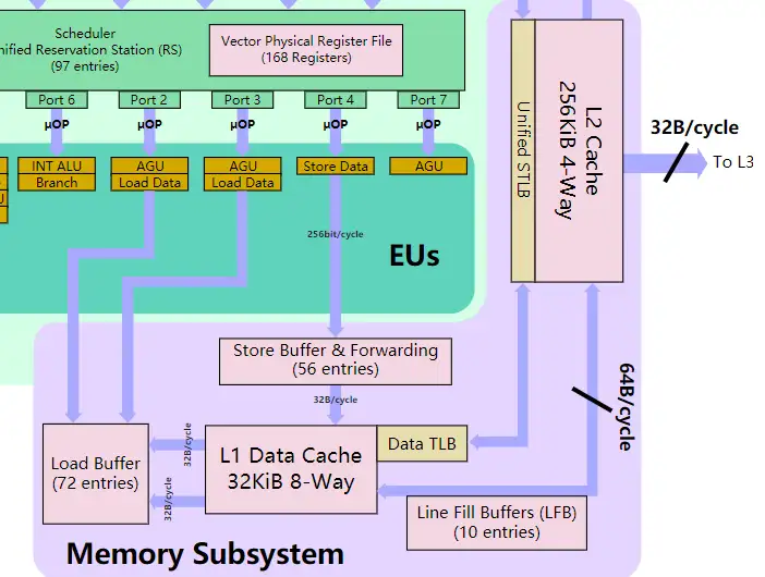图中紫色的模块,在 EU(执行单元)在执行指令时候,L1 数据 Cache 负责供给执行指令期间所需要的数据。从图中可以看到 L1 数据缓存是 8- 路并行数据缓存,L1 数据缓存可以通过数据页表地址缓存从 L2 提取数据与存储数据。