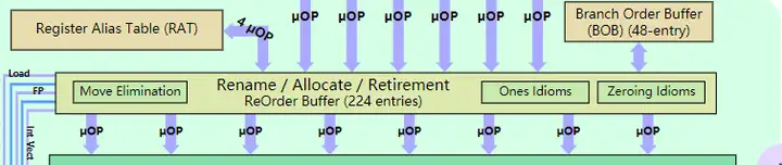 - **ROB(re-order buffer):重新排序缓冲区。ROB 的存在 ROB 的目的为存储 out-of-order 的处理结果,作为 EU 的入口兼部分出口,它是乱序执行的最基本保证。当指令被传如 ROB 中,微指令流会以顺序执行的方式传入到后面的 RS,在经过 ROB 时,会占用 ROB 的一个位置,这个位置是存储微指令乱序执行处理完成时候的结果,之后经过整合会顺序写回到相应的寄存器。而微指令在经过 ROB 时候会做一些优化。(消除寄存器移动,置零指令与置一指令等)。此外对于超线程中的寄存器别名技术在此经过 RAT(寄存器别名表)进行寄存器重命名。